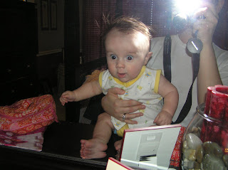 I am behind on my posts and meant to put these pictures on here last week but it has been kind of crazy around here. Anyhow, here are some pictures of Connor relaxing in his Bumbo under one of our only shade trees. He was very interested in the texture of the grass and loved watching me water the flowers that we planted last weekend. I have to say it was GREAT getting to work in the yard again for the first time in over a year to do some landscaping. Last year we had so much going on with yard projects but I had just found out I was pregnant so I didnt feel like doing much. I pushed Connor around in the stroller while I worked in each of the beds and he was a champ! I was amazed! I can only hope that he continues with this. We havent gotten much rain lately and I need the water the flowers at least every other day and it is hard with a 4 1/2 month old! I am so glad that it is finally warm to stay and the flowers are in full bloom!!